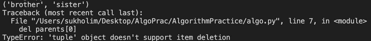 # 소괄호 사용, 생략 가능 parents = ('mother', 'father') siblings = 'brother', 'sister' print(siblings) # immutable이기 때문에 에러 del parents[0]