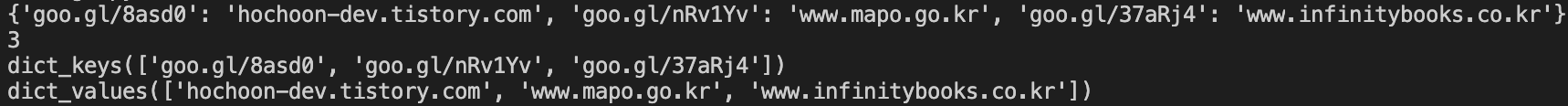 URLS = dict() URLs['goo.gl/8asd0'] = 'hochoon-dev.tistory.com' URLs['goo.gl/nRv1Yv'] = 'www.mapo.go.kr' URLs['goo.gl/37aRj4'] = 'www.infinitybooks.co.kr' print(URLs) print(len(URLs)) print(URLs.keys()) print(URLs.values())