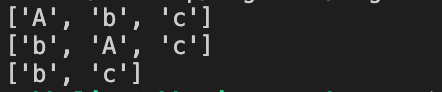 L = ['a', 'b', 'c'] L[0] = 'A' print(L) L[0], L[1] = L[1], L[0] print(L) del L[1] print(L)