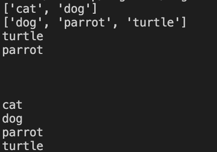 pets = ['cat', 'dog', 'parrot', 'turtle'] print(pets[0:2]) # 슬라이싱 print(pets[-3:]) # 슬라이싱 -